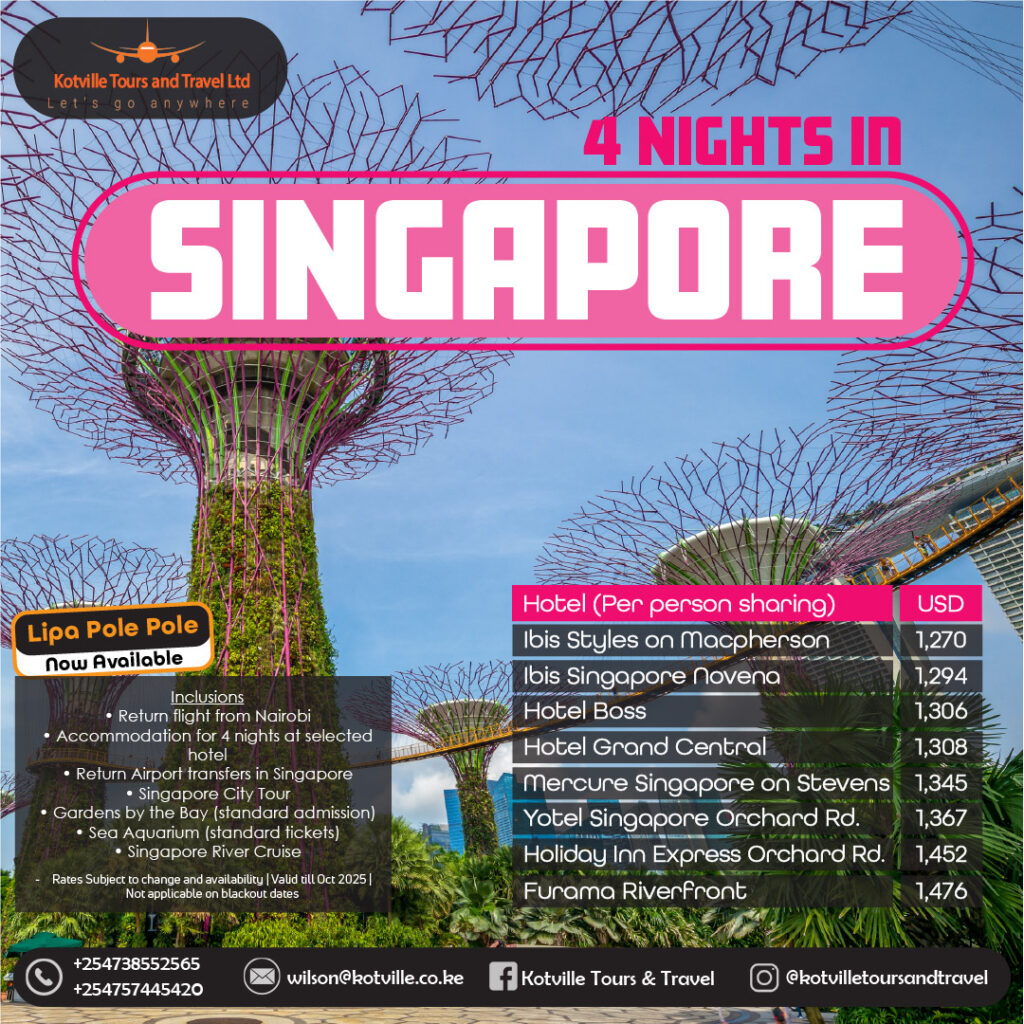 Traverse through the beautiful and advanced city of Singapore with a specially curated tour package from just USD 1270 Per person sharing! Package includes air tickets, Sentosa tour, Sky Park Observation deck tour, City Tour, Garden by the bay tour and much more! Get in touch with us today on +254738552565 or reach out to us on our socials for bookings and more!