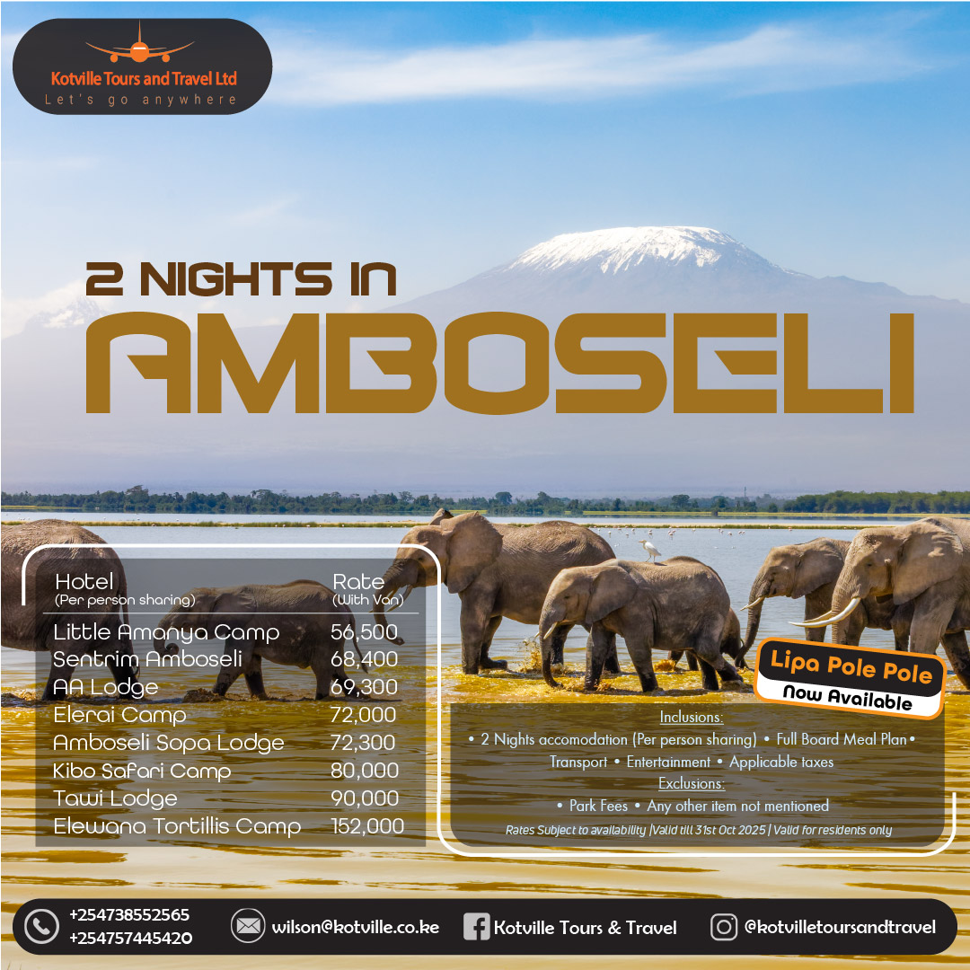 Settle down on vacation amidst the grasslands of the Great Amboseli Grasslands! Book your 2 night adventure inclusive of game drives and transport! Get in touch with us today on +254738552565 or reach out to us on our socials for bookings and more!