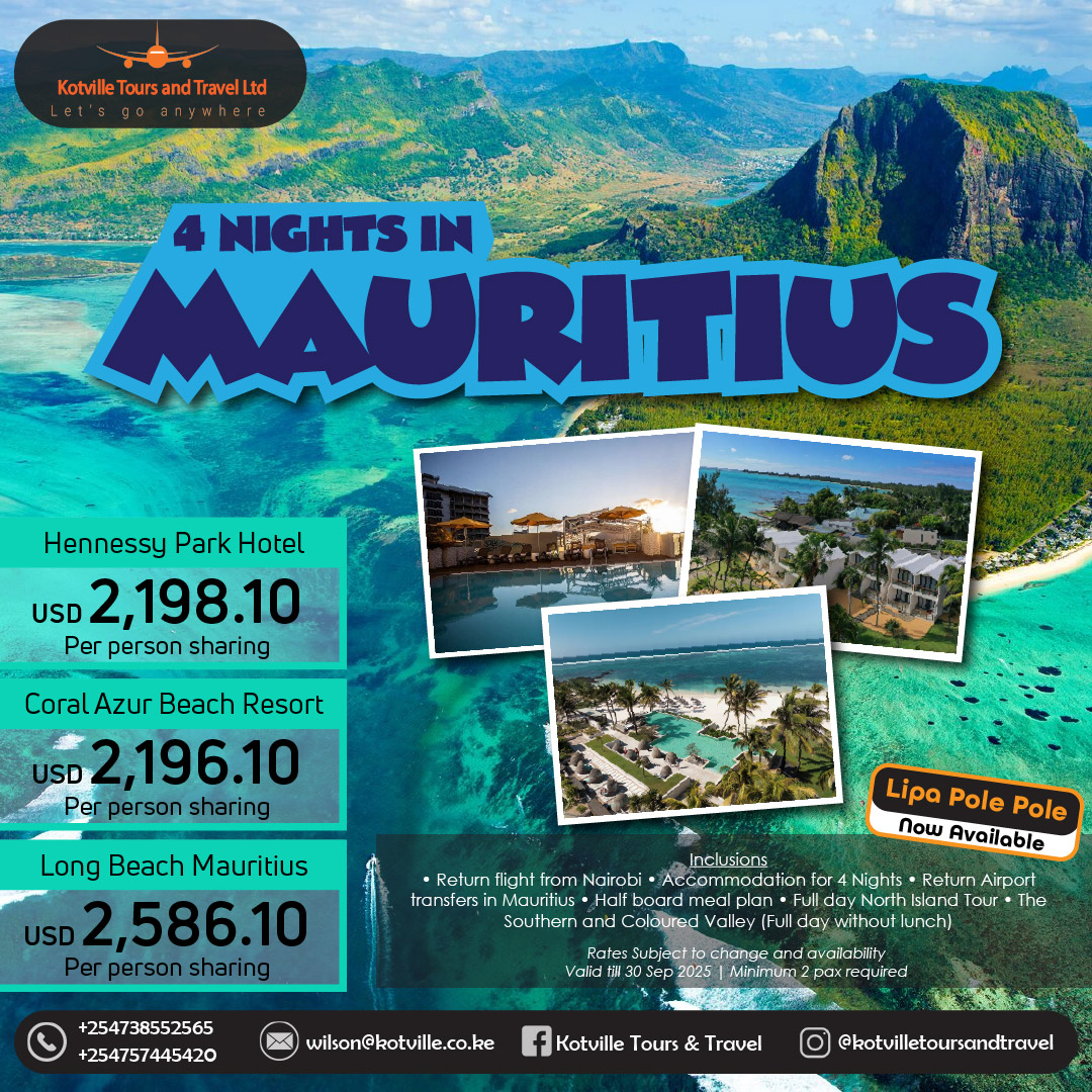 Delve into beautiful island of Mauritius from just USD 2,198.10 per person sharing. Explore the great beaches and stay in exquisite hotels for 4 nights! Get in touch with us today on +254738552565 or reach out to us on our socials for bookings and more!