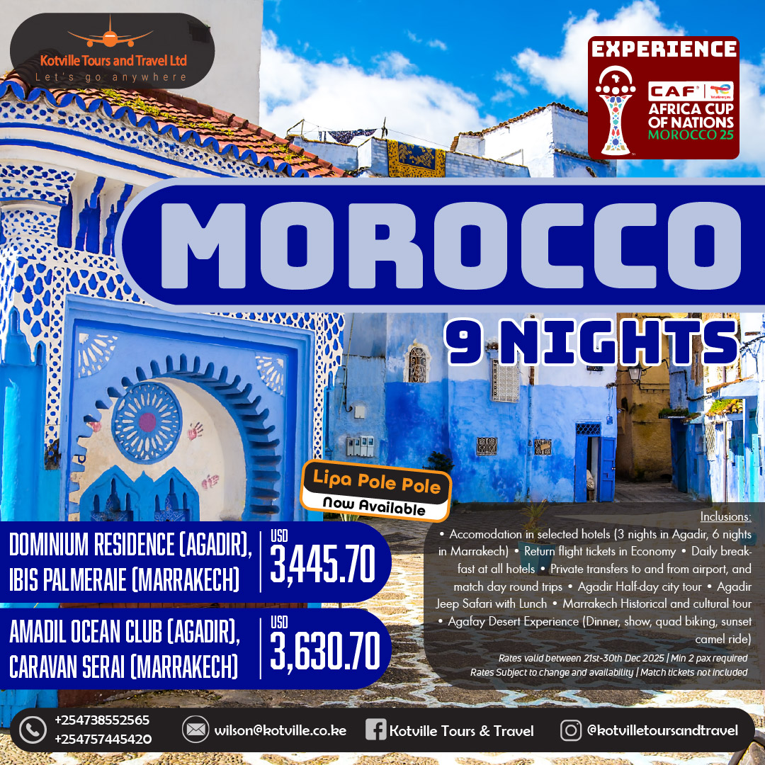 Prepare for the AFCON 2025! Book your Morocco adventure today and enjoy the AFCON alongside beautiful tours and excursion in Morocco! Get in touch with us today on +254738552565 or reach out to us on our socials for bookings and more!